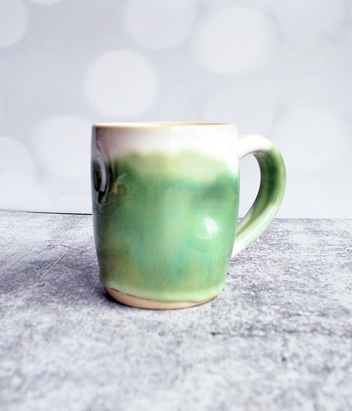 Handmade mug, created on the wheel, with a hand-pulled handle. Glazed in flowing cream and green, with two indents in the clay for easy holding.