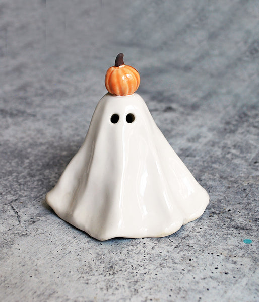 This cute little ghost is the perfect Halloween decor. This ghost friend has a little orange pumpkin on his head.