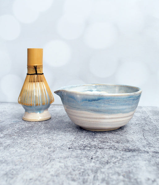 Handmade whisk holder, created on the wheel with light cream and blue glaze. Dishwasher safe.