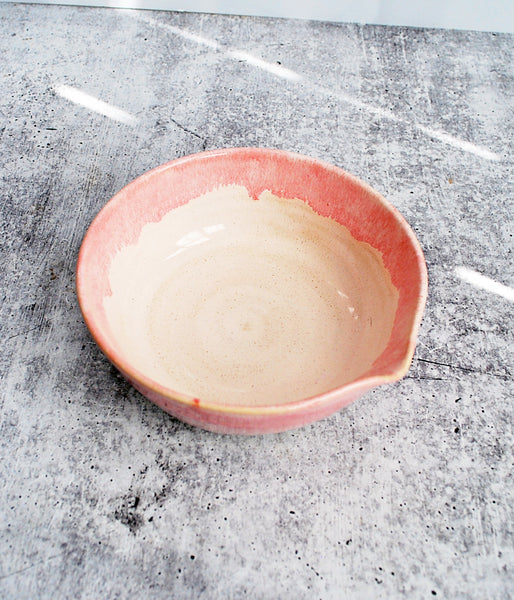 Handmade bowl with spout, created on the wheel with light cream and pink glaze.